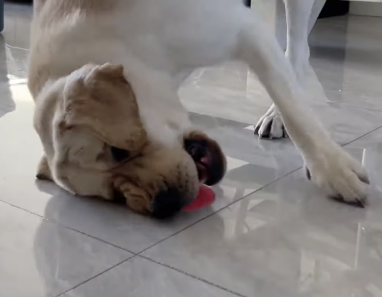 おもちゃが張り付いて取れない! 犬さんが本気で噛みついてみると?
